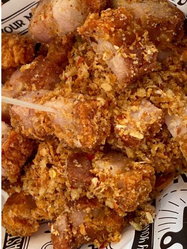 crispy pork seasoned with fried garlic and red pepper crunch - popular dishes